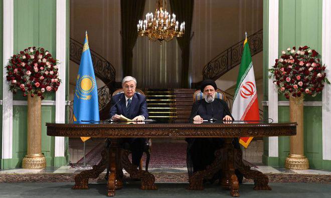 哈薩克斯坦總統Kasym-Jomart Tokayev和伊朗總統 Ibrahim Raisi在德黑蘭歡迎首趟哈薩克斯坦-伊朗-土耳其列車后發表的聯合新聞聲明。資料來源:Akorda.kz。