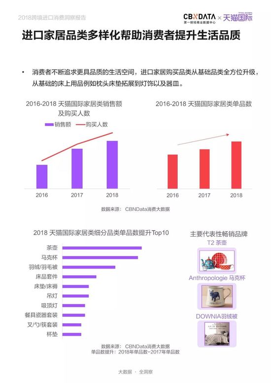 居家生活的幸福感又豈止來自于“接軌前沿科技”,從零食美酒到床上用品都可以通過跨境消費獲得品質升級。根據CBNData《報告》顯示,“客廳主角”美酒和健康零食在天貓國際近兩年銷售額穩步增長;在酒類跨境消費方面,消費者正從傳統葡萄酒消費逐漸過渡到啤酒及洋酒類,同時產地選擇也日益豐富,墨西哥、新西蘭、瑞典等小眾產地的酒類增速最快;在健康零食方面,堅果類食品熱度提升最快,此外葡萄籽油、椰子油等主打健康減脂、美容抗衰老等概念的食用油也隨著這股健康潮熱度攀升。