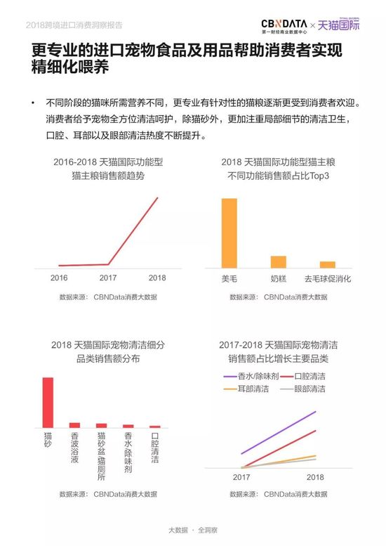 此外,基于不同階段的貓咪所需營養不同,更專業且具針對性的貓糧逐漸更受到消費者歡迎,其中具備美毛、奶糕、去毛球促消化功能的貓主糧在2018年銷售額占比位列前三;在寵物清潔呵護方面,除貓砂外,消費者更加注重寵物的局部細節清潔衛生,其中口腔、耳部以及眼部清潔熱度不斷提升。