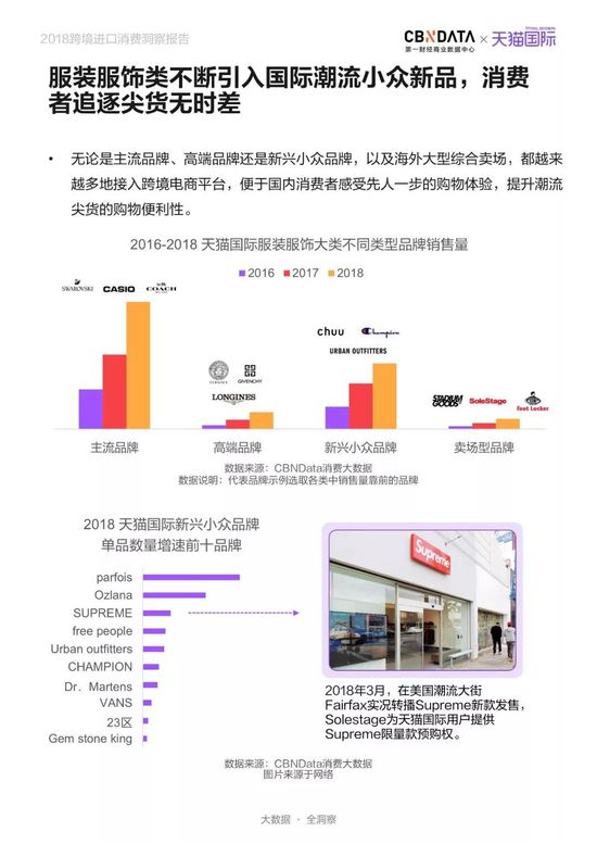 同時,隨著parfois、Ozlana、SUPREME等新興小眾品牌單品在2018天貓國際消費熱度高漲,以及Nike Air Vapormax FK x OFF WHITE、Air Jordan 1 x Off-White、川久保玲CDG PLAY x Converse等聯名款潮品在近兩年的熱銷,越來越多國外品牌如freepeople、Urban outfitters等被吸引來華落地,為中國消費者帶來尖端潮流的零時差體驗。