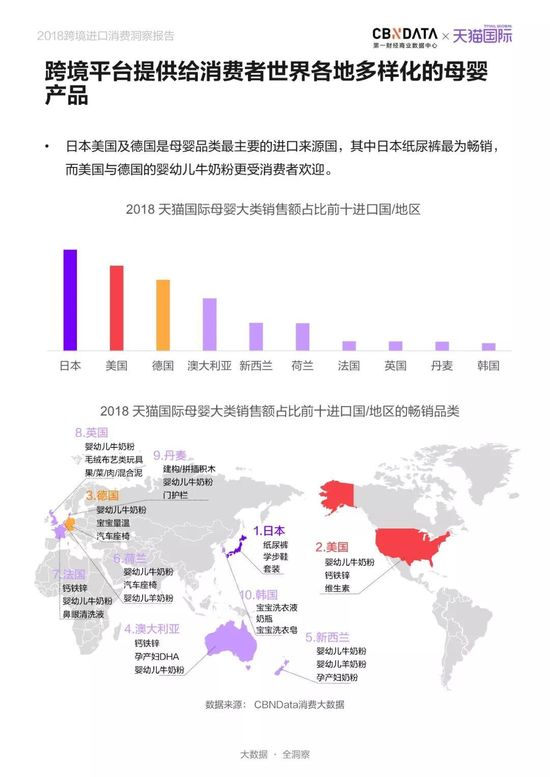 CBNData《報告》顯示,消費者在跨境平臺購買母嬰用品逐漸成為常態,隨著越來越多90/95后人群加入寶爸寶媽行列,他們正逐漸成長為跨境母嬰消費主要人群。從近兩年的跨境母嬰品類銷售額占比來看,嬰兒食品類消費占比最大,其中含有鈣鐵鋅、維生素、DHA等營養素的嬰幼兒營養品占比快速提升。從母嬰產品進口地來看,日本、美國及德國是母嬰品類最主要的進口來源國,其中日本紙尿褲最為暢銷,而美國與德國的嬰幼兒牛奶粉更受消費者歡迎。