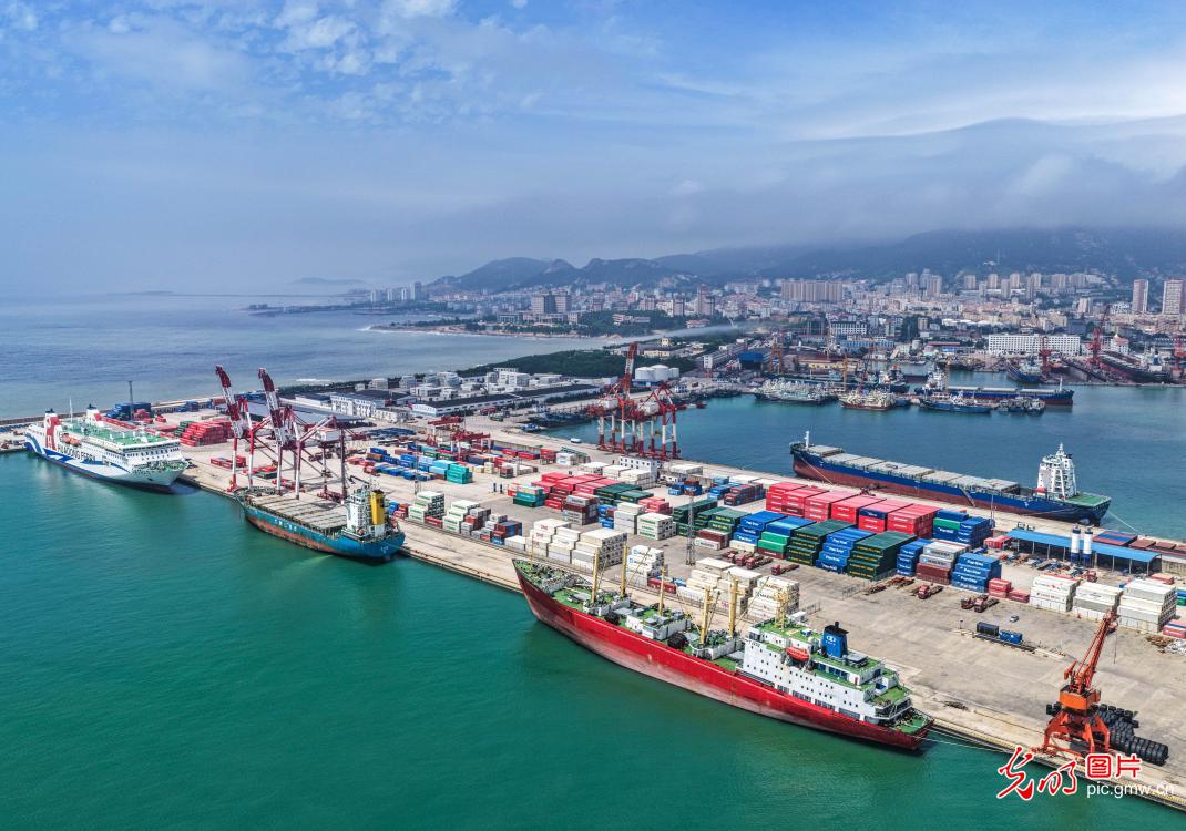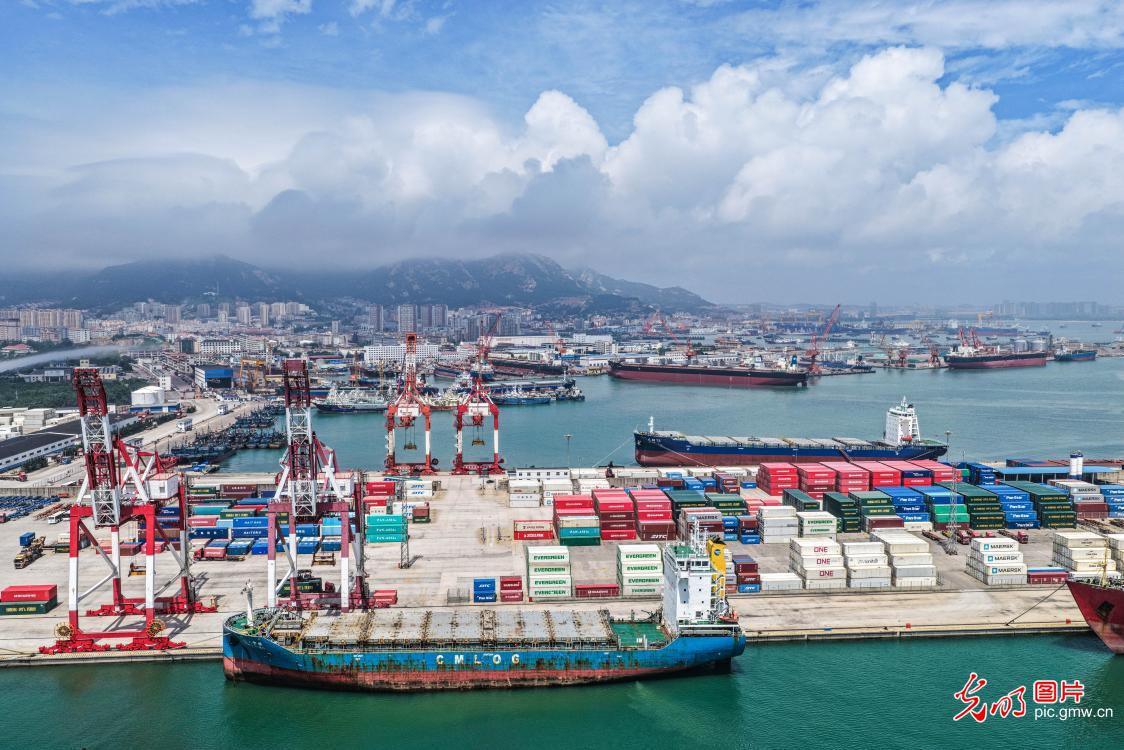 2025年7月22日,在山東省榮成市石島管理區石島新港口岸,滿載跨境電商貨物的“華東明珠8號”等多艘貨輪緊張有序地進行集裝箱裝卸作業。近日,榮成市首趟亞歐班列在石島管理區石島新港順利通行,標志著榮成市在融入“一帶一路”倡議、拓展國際物流通道方面邁出了重要一步。作為聯通亞歐的全新物流紐帶,該趟班列的開通,將進一步加強榮成與中亞、歐洲地區的經貿合作,為區域經濟發展注入新動力。(李信君攝/光明圖片)