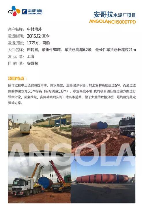 2016年1月,思銳物流連續(xù)承運(yùn)安哥拉羅安達(dá)某水泥廠兩批次貨物,貨物總量17000方,其中大件水泥回轉(zhuǎn)窯9節(jié),貨量2300方,最重件90噸,車貨總高超過6.20m。