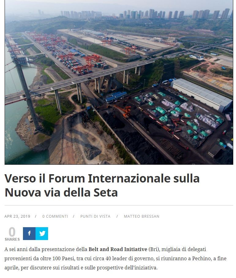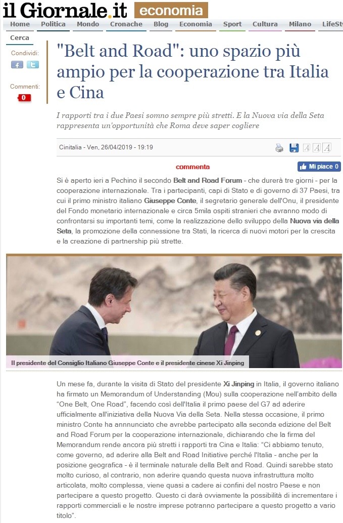 24日,《日報》網站刊發總臺國廣特約智庫馬特奧.布雷桑援引總臺特稿撰寫的評論文章《意大利將參加第二屆“一帶一路”國際合作高峰論壇》。文章指出,作為G7第一個與中國簽署 “一帶一路”倡議合作諒解備忘錄的國家,意大利總理孔特此次赴北京參加第二屆“一帶一路”國際合作高峰論壇,共商備忘錄將給意中兩國帶來的各項機遇。