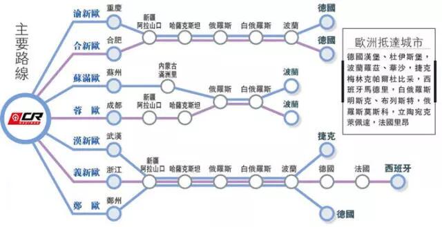 中歐國際鐵路聯運大通道:利用南線歐亞大陸橋這條國際鐵路通道,從重慶出發,經西安、蘭州、烏魯木齊,向西過北疆鐵路,到達邊境口岸阿拉山口,隨后進入哈薩克斯坦,再經俄羅斯、白俄羅斯、波蘭,至德國杜伊斯堡,全長11,179公里。