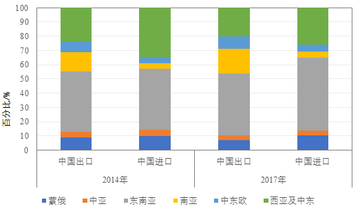 圖1 2014年和2017年中國與“一帶一路”沿線六大板塊貿易對比