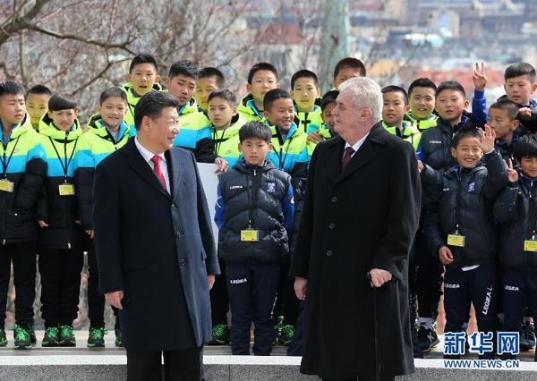 3月29日,國家主席習近平在布拉格同捷克總統(tǒng)澤曼舉行會談。會談后,兩國元首共同會見中捷冰球、足球少年運動員。