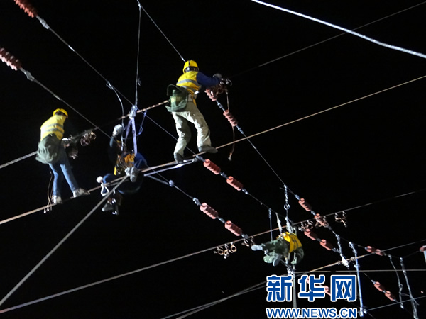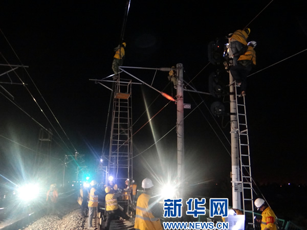 中國鐵建電氣化局集團一公司工程技術人員在凌晨進行接觸網施工作業。