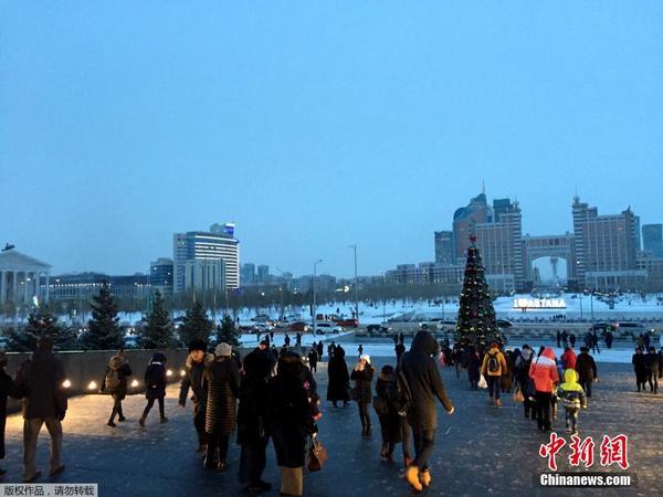 12月16日,哈薩克斯坦迎來獨立日,全國舉行各種盛大活動慶祝國家獨立25周年。圖為哈首都阿斯塔納市民前往“可汗之帳”參加慶祝活動。“可汗之帳”為世界最大帳篷,系阿斯塔納市標志性建筑。