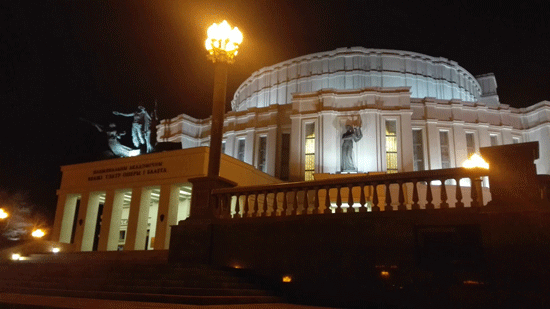 白俄羅斯國家大劇院位于巴黎公社大街1號。1940年被授予列寧勛章并獲得大劇院稱號。1964年獲得“學術劇院”地位,1996年獲得“國家大劇院”地位。白俄羅斯國家大劇院現有445名演出人員,有110名獲得過國家獎項,大劇院的曲目包括89個歌劇和芭蕾戲劇,最近幾年在30多個國家科進行過巡回演出。盡管我們行程安排得非常緊,熱情的主人還是在5月4日晚上邀請我們一行前往白俄羅斯國家大劇院觀看了歌劇《沙皇的未婚妻》,現場感受了白俄羅斯的歌劇文化。