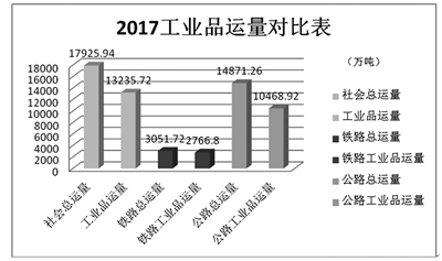 2017年,工業品總運量完成13235.72萬噸,占社會總運量比重73.8%。其中,工業品鐵路運量2766.8萬噸,占鐵路總量比重90.7%。工業品公路運量10468.92萬噸,占公路總運量比重70.4%。石油、鉀肥、煤、焦炭、原鹽、純堿、粗鋼、電解鋁、石灰石等運量占比大,是公路和鐵路主要運輸品類,大宗工業品運輸依然是支撐我省物流業發展的主要力量。
