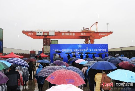 1月10日,贛州國際港-廣州港“同港同價同效率”“海上絲綢之路”班列到港儀式在贛州國際陸港舉行。