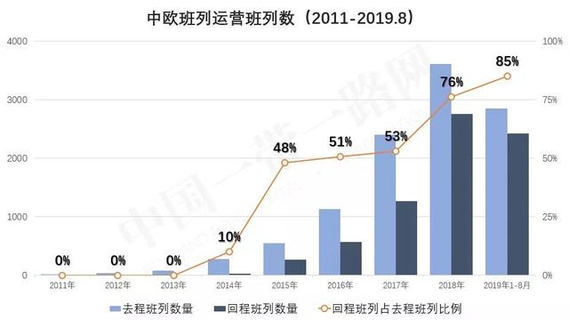 通過整合2011年至2019年8月的開行數據,可以看出,回程班列占去程班列的比例從無到有,逐年上升,去年達到“去三回二”,今年實現了“去一回一”,市場拓展取得了實際成效。