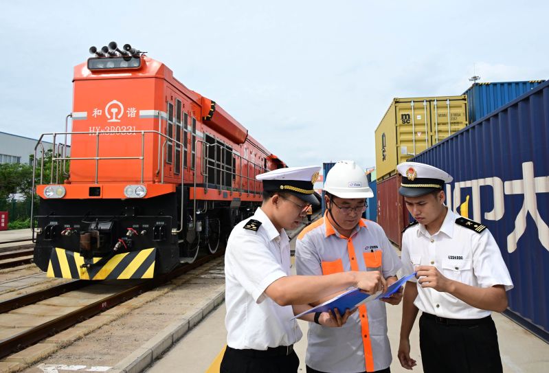 圖為:海關(guān)關(guān)員監(jiān)管中歐班列開行 李紫恒/攝
